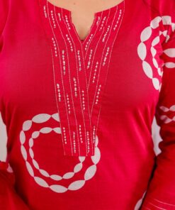 Paired with matching red bottoms and a beautifully printed mulmul dupatta, this set is perfect for daily wear, festive occasions, or office styling. The lightweight, soft-touch fabric ensures comfort all day long.